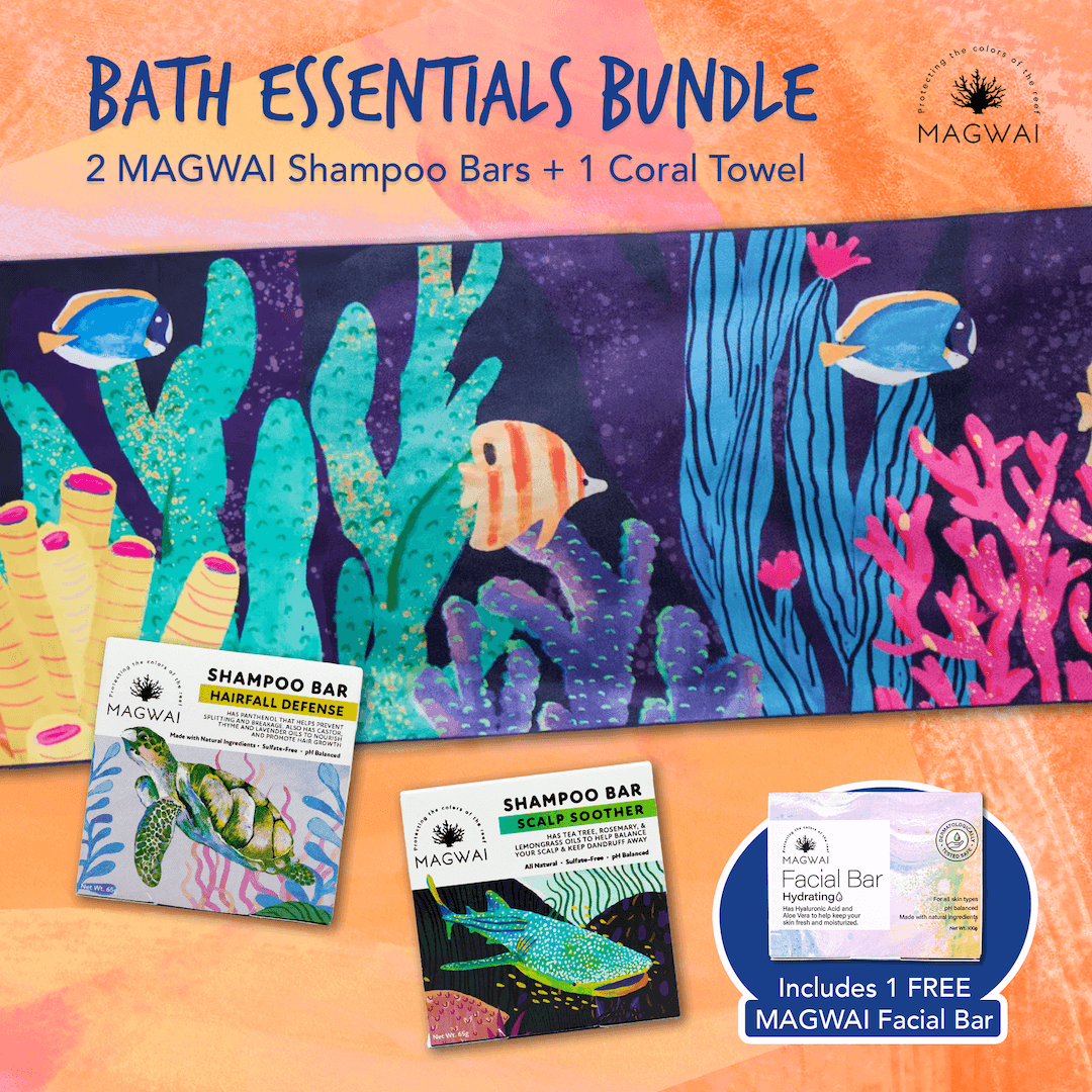 Bring your love for the ocean into your home with MAGWAI's Bath Essentials Bundle. This includes a multi-purpose towel made of 10 recycled plastic bottles and two plastic-free shampoo bars.