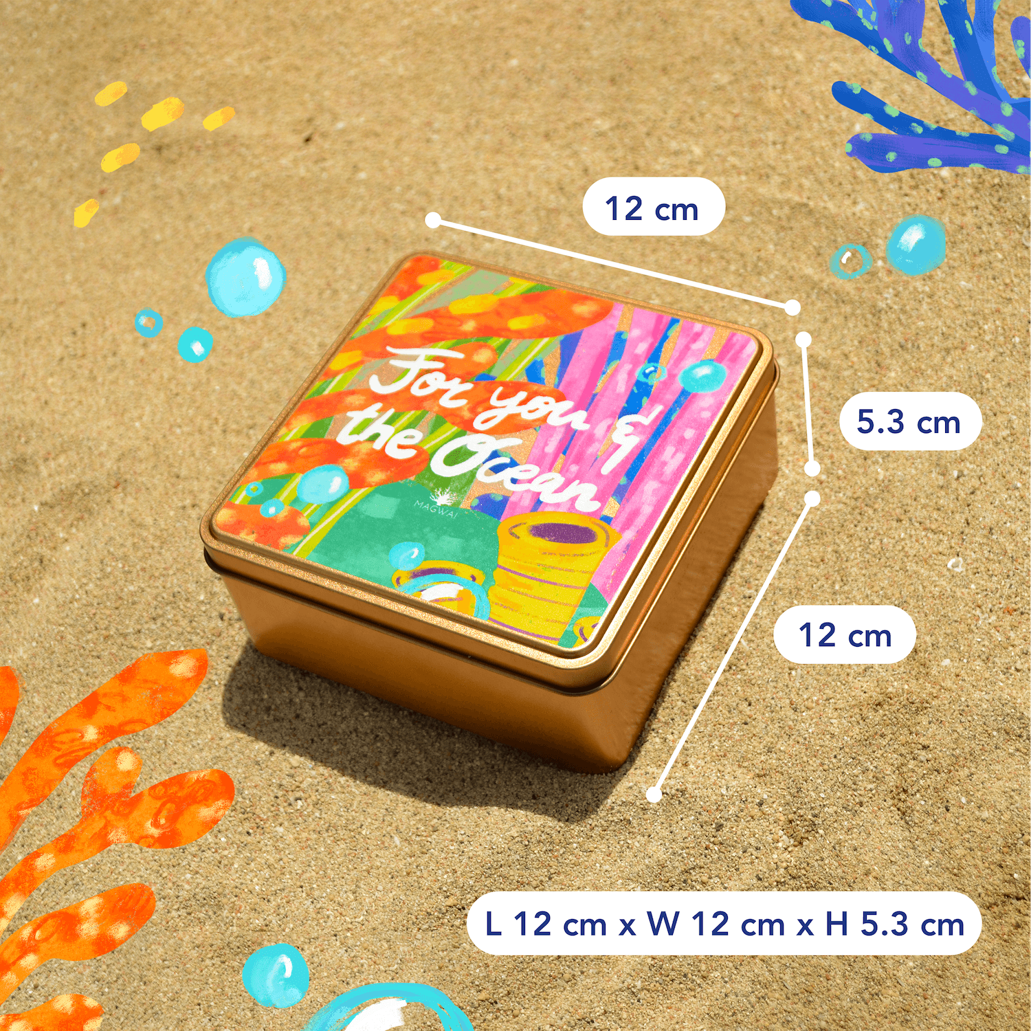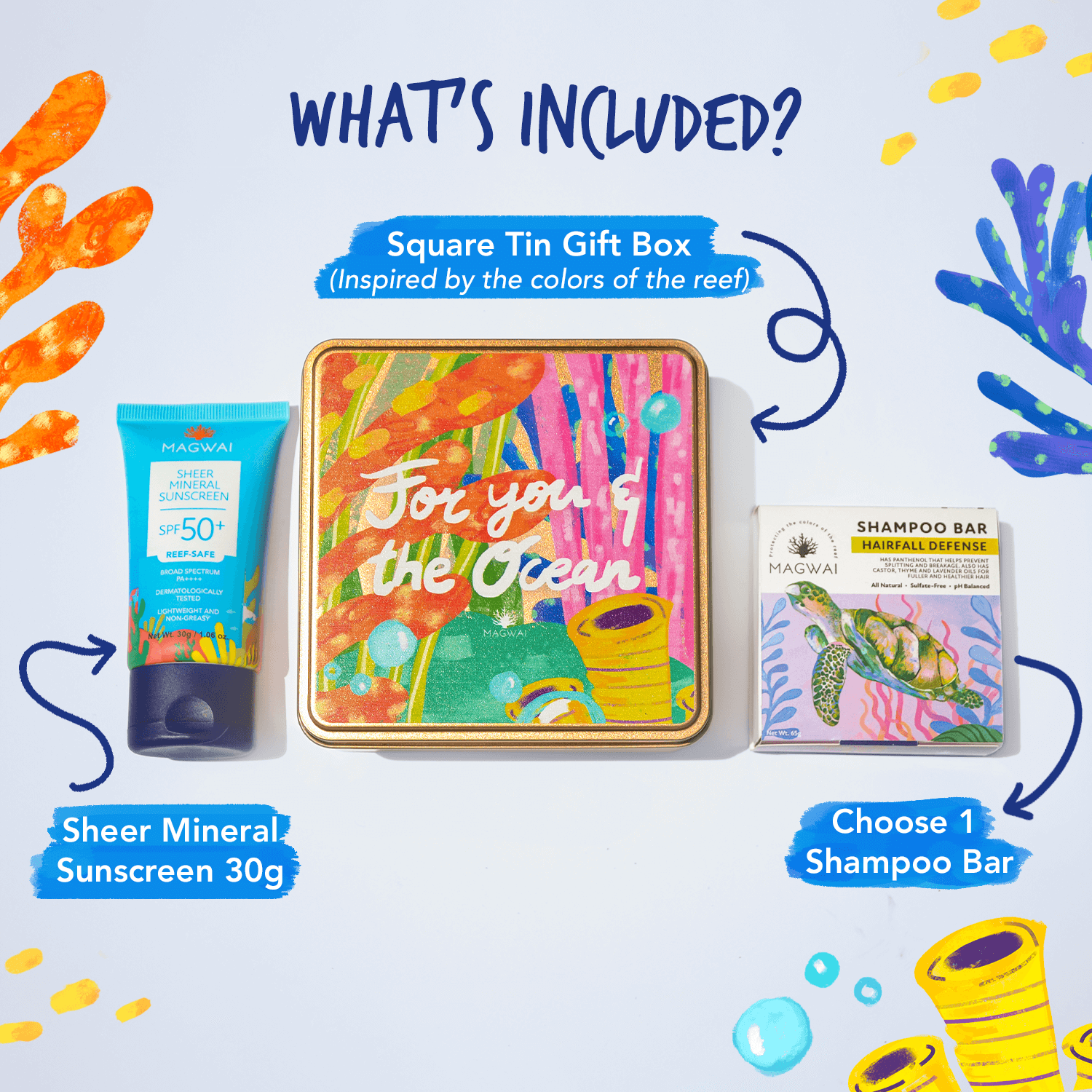 MAGWAI Coral Treasures Set | Square Tin Gift Box + Shampoo Bar + Sheer Mineral Sunscreen 30g